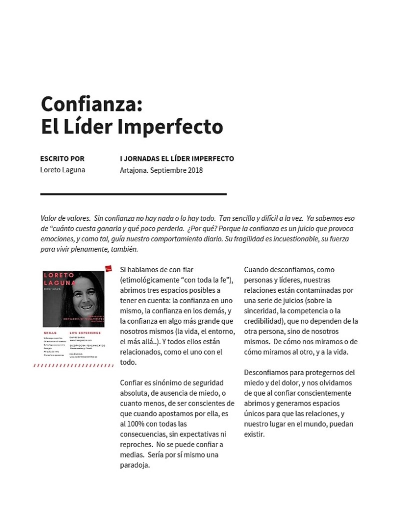 Valor de valores. Sin confianza no hay nada o lo hay todo. Tan sencillo y difícil a la vez. Ya sabemos eso de “cuánto cuesta ganarla y qué poco perderla. ¿Por qué? Porque la confianza es un juicio que provoca emociones, y como tal, guía nuestro comportamiento diario. Su fragilidad es incuestionable, su fuerza para vivir plenamente, también.